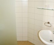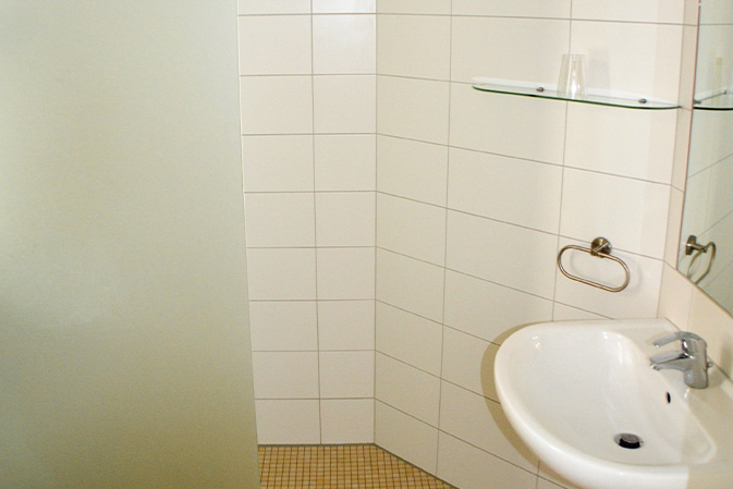 Das Bad ist ausgestattet mit einer Dusche, Waschbecken und WC. Weiterhin gehören ein Föhn sowie ein großer Spiegel zur Ausstattung.