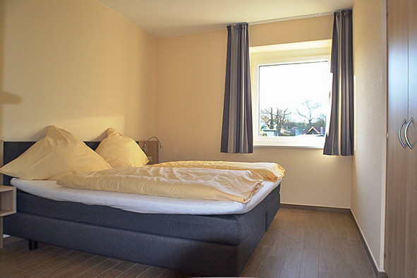 In den 2 Schlafzimmern steht je ein Doppelbett. Hierbei handelt es sich um Boxspringbetten in Hotelzimmerqualität. Es gibt keine sogenannte Besucherritze. Bettwäsche ist im Mietpreis enthalten. Es gibt je einen großen Kleiderschrank, hier können die für einen schönen Urlaub am Ostseestrand nötigen Kleidungsstücke problemlos untergebracht werden. Die Fenster in den Schlafräumen lassen sich mit einem elektrischen Rollo fast komplett verdunkeln.