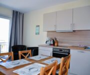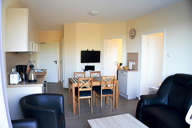 Der Wohnbereich ist ausgestattet mit einem 32 Zoll TV und einer Mikrostereoanlage, mit der auch DVDs abgespielt werden können. Aus den bis zum Boden reichenden Fenstern im Wohnbereich haben Sie einen schönen Blick über die Ostsee. In der Ferienwohnung Fernblick am Ostseestrand gibt es kostenloses WLAN und einen ebenfalls kostenlosen Safe.