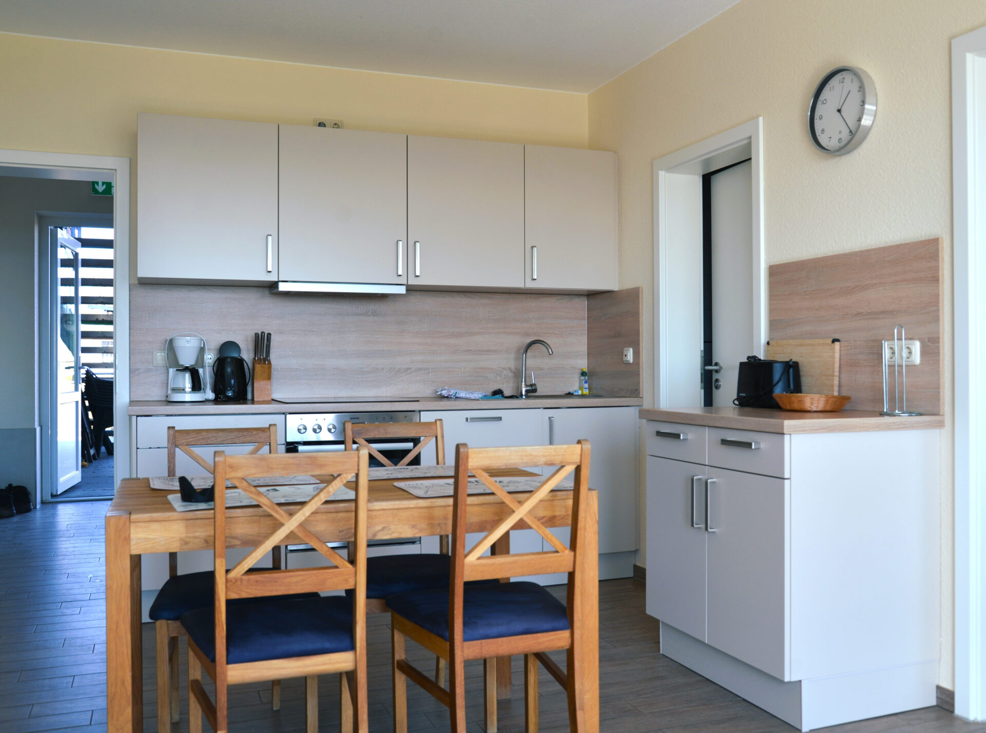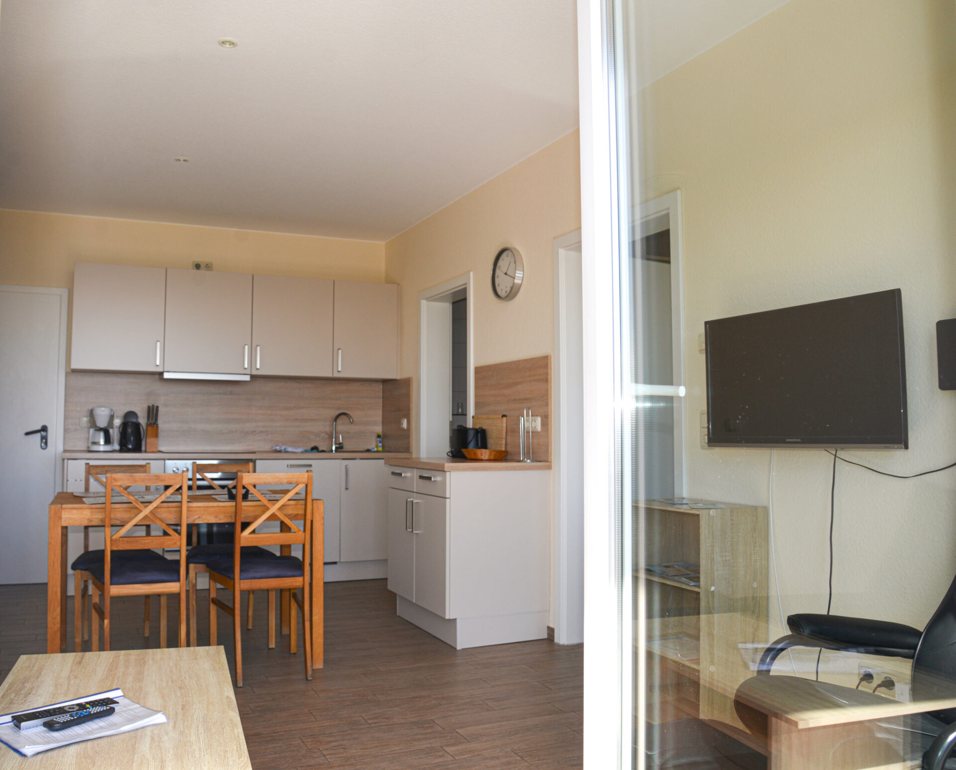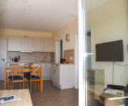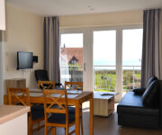Die Ferienwohnung Meerblick am Strand der Ostsee ist geeignet für 2 bis 3 Personen. Die Ferienwohnung Meerblick befindet sich im 1. OG und ist bequem über einen Fahrstuhl zu erreichen. Die Wohnung ist komplett ausgestattet. Es gibt einen 4-Platten-Ceranherd mit Backofen, eine Geschirrspülmaschine sowie Toaster, Wasserkocher und Kaffeemaschine.