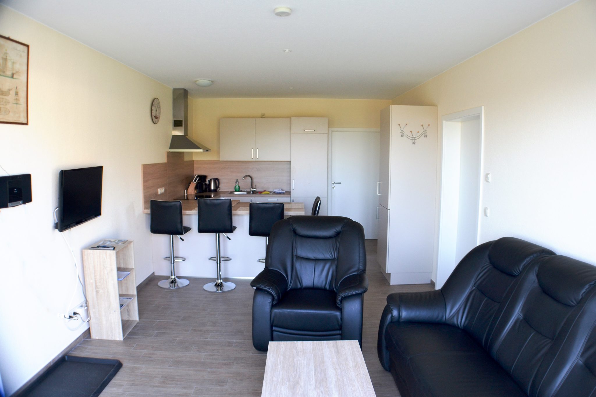 Der Wohnbereich ist ausgestattet mit einem 32 Zoll TV und einer Mikrostereoanlage mit der auch DVDs abgespielt werden können. Aus den bis zum Boden reichenden Fenstern im Wohnbereich haben Sie Blick auf die Ostsee.