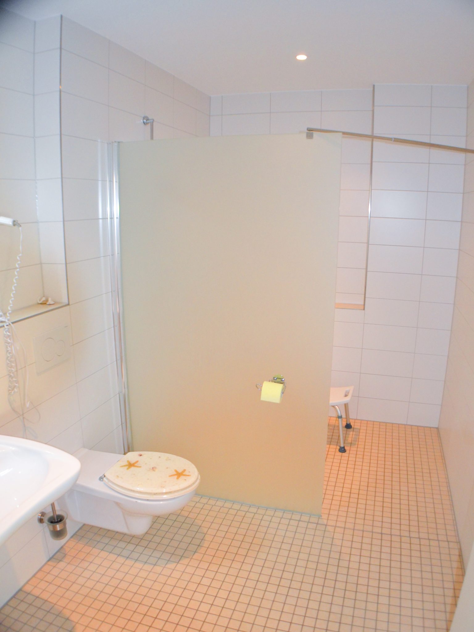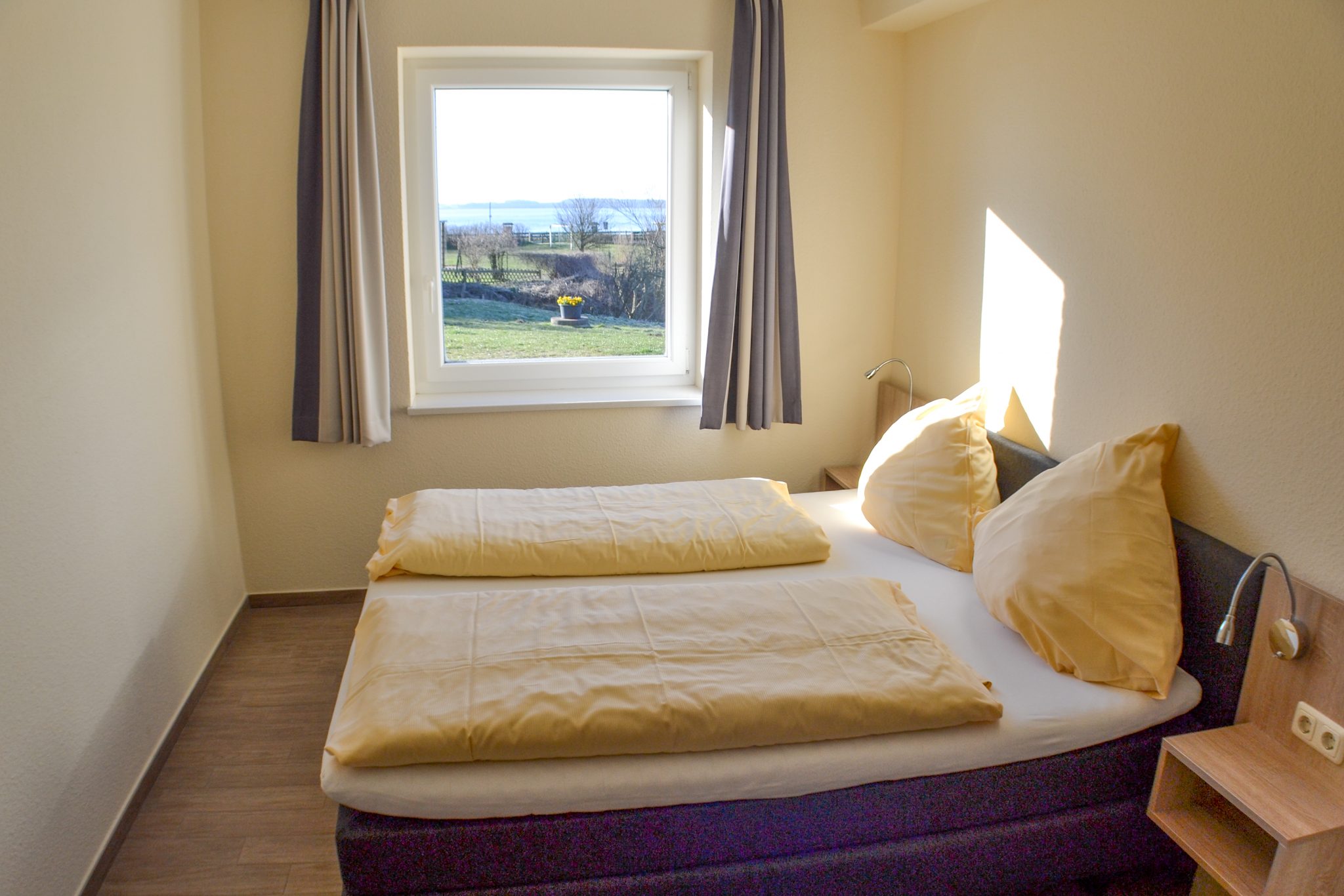 Im Schlafzimmer steht ein Doppelbett. Hierbei handelt es sich um ein Boxspringbett in Hotelzimmerqualität. Es gibt keine sogenannte Besucherritze. Außerdem gibt es ein Einzelbett. Bettwäsche ist im Mietpreis enthalten. Es gibt einen geräumigen Kleiderschrank, hier können die für einen Erholsamen Urlaub am Ostseestrand nötigen Kleidungsstücke problemlos untergebracht werden. Das geräumige Bad ist ausgestattet mit einer ebenerdigen Dusche. Waschbecken und WC sind auch für Rollstuhlfahrer geeignet. Weiterhin gehören ein Föhn sowie ein großer Spiegel zur Ausstattung.