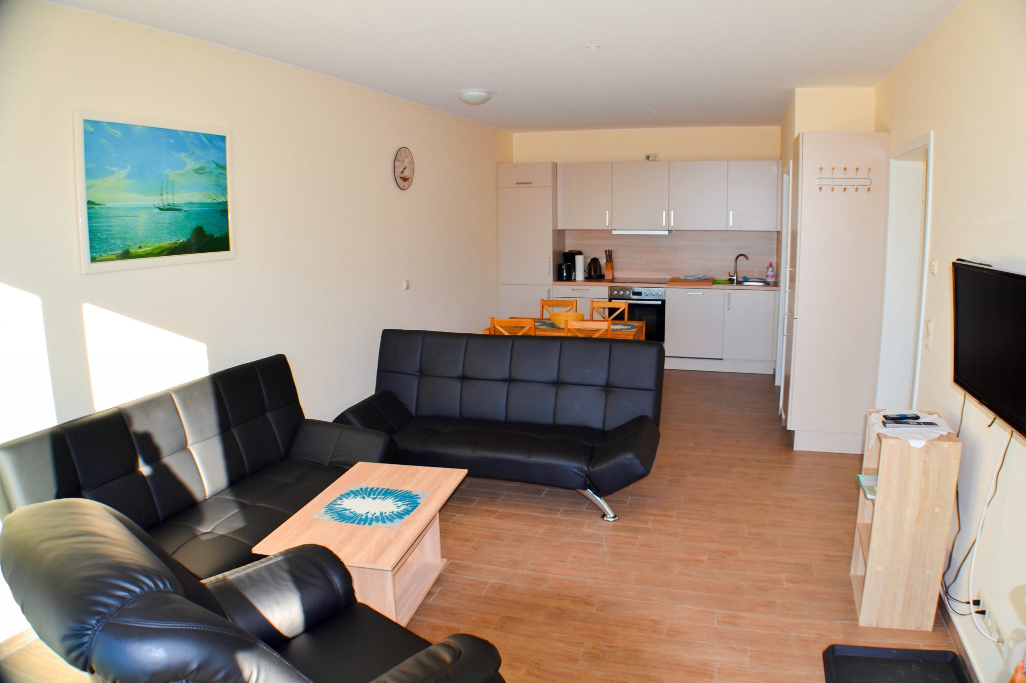 Die Ferienwohnung Ostseewelle am Meeresstrand ist für 3 Personen komplett ausgestattet. Es gibt im Küchenbereich einen 4-Platten-Ceranherd mit Backofen, eine Geschirrspülmaschine sowie Toaster, Wasserkocher und Kaffeemaschine. Der Wohnbereich ist ausgestattet mit einem 32 Zoll TV und einer Mikrostereoanlage mit der auch DVDs abgespielt werden können. Im Wohnbereich gibt es zwei Schlafcouchen in denen gegebenenfalls weitere Personen schlafen können. Aus den bis zum Boden reichenden Fenstern im Wohnbereich haben Sie einen schönen Blick auf die Ostsee. Es gibt kostenloses WLAN und einen ebenfalls kostenlosen Safe.